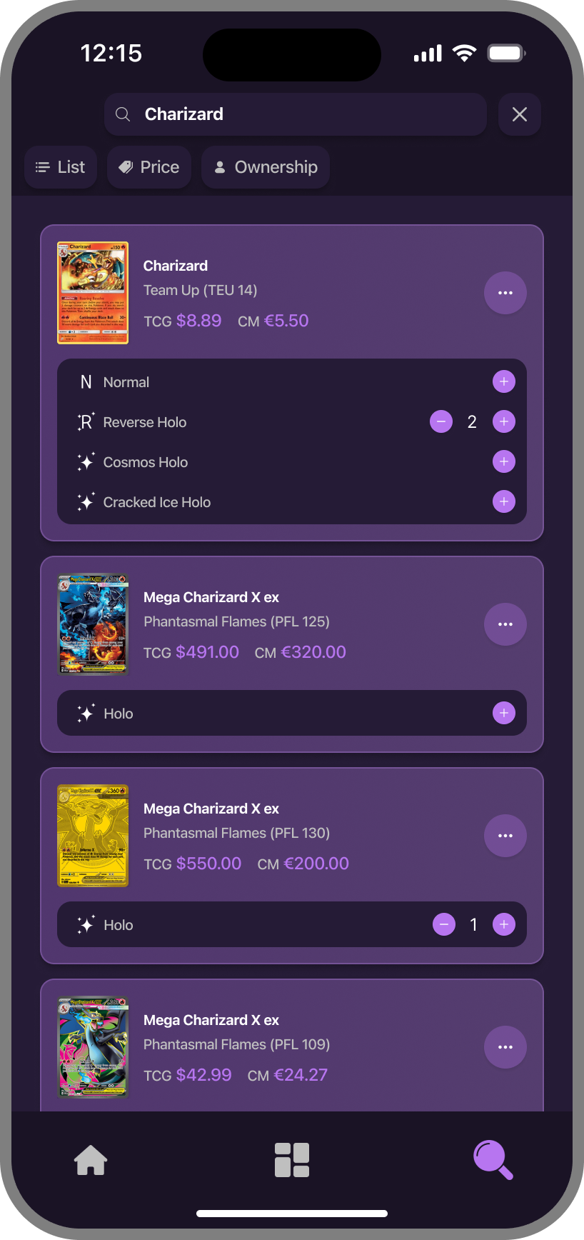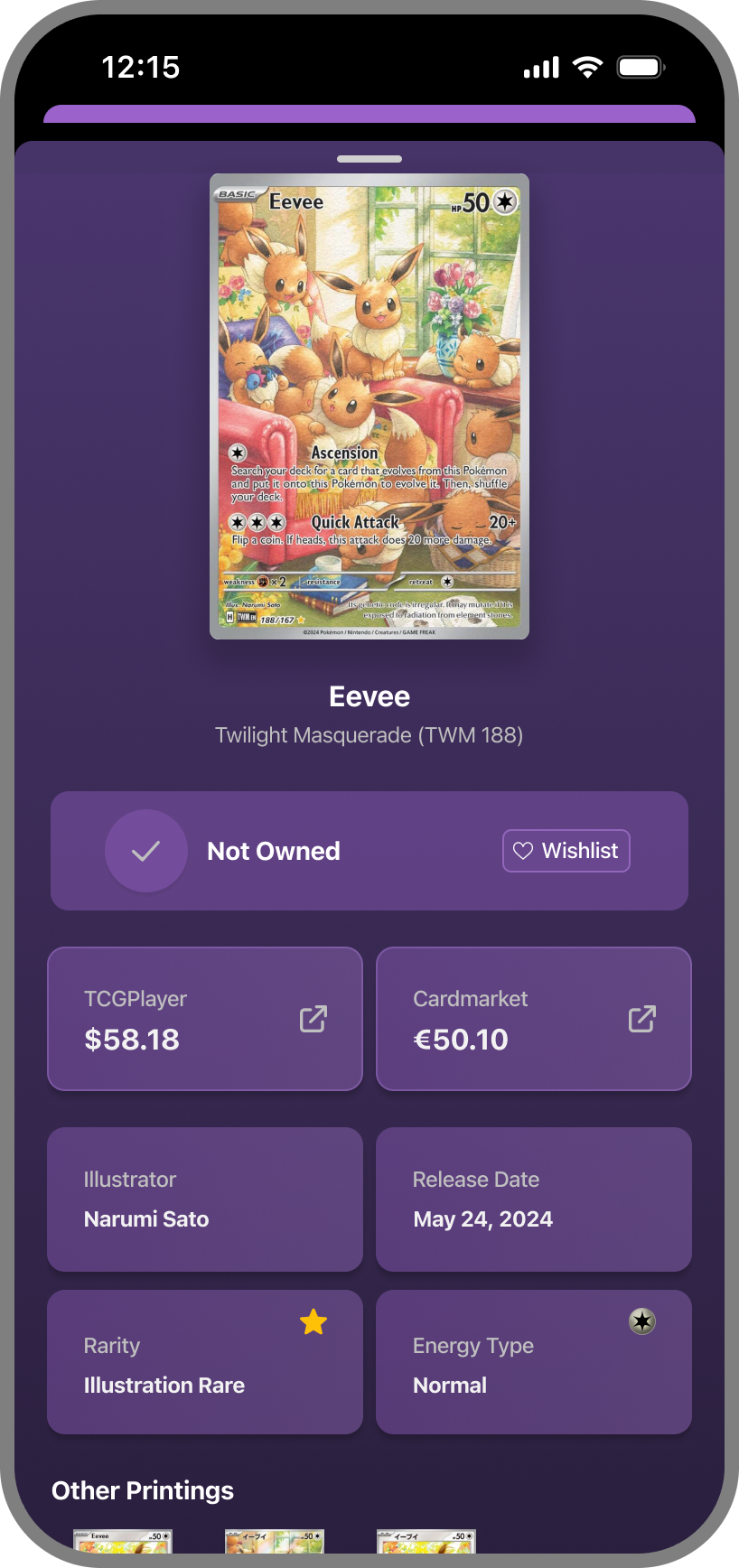 Tap any card to see everything that matters. Track ownership, view prices across markets, discover the artist, check rarity, release date, and explore all available printings. Know your cards inside and out.