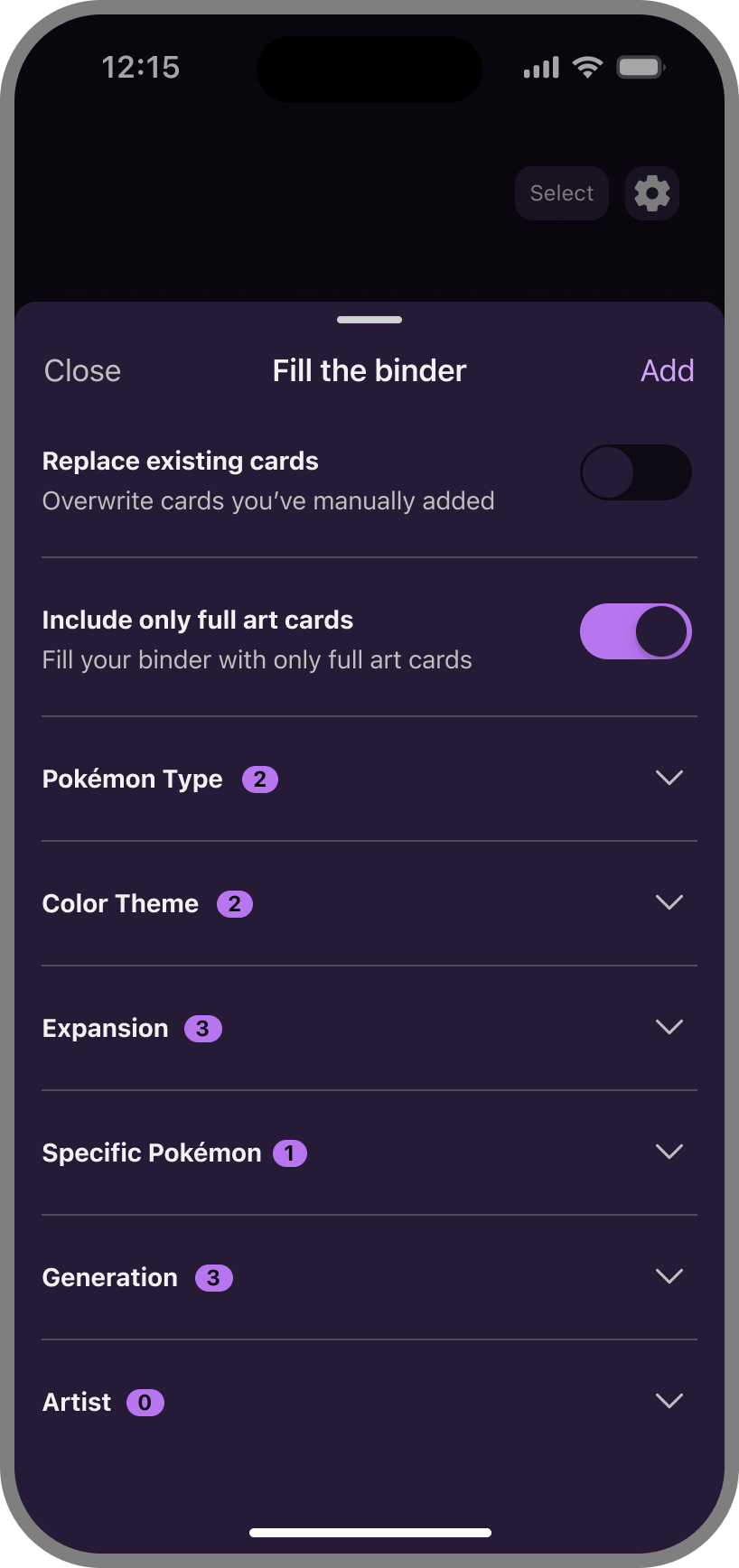 Add cards one by one if you're a hands-on collector, or hit the Pokeball button and let our algorithm instantly fill your binder with cards that match your aesthetic. Choose your collection style, change it anytime.