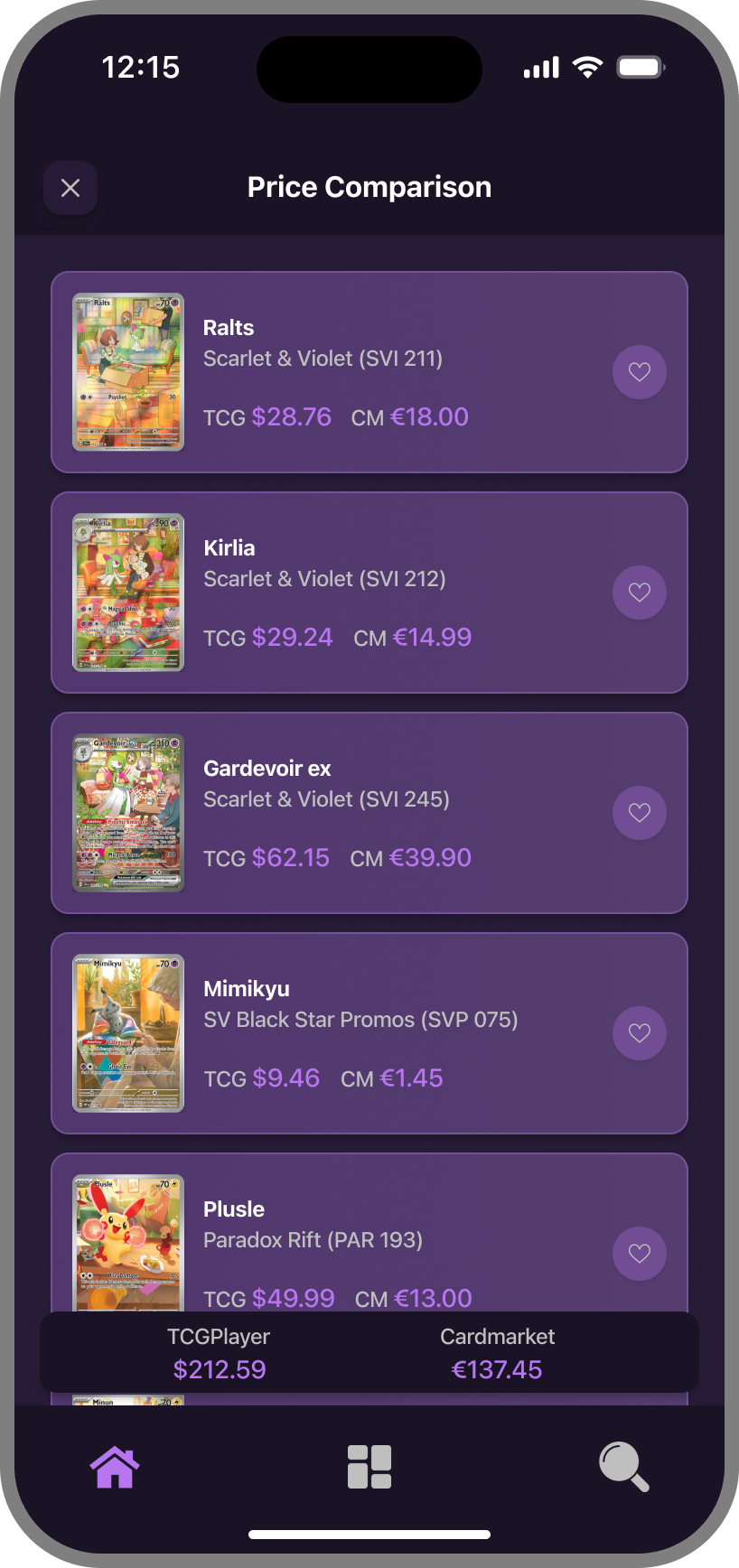 Search for any card and instantly see prices from both TCGPlayer and Cardmarket. Make informed decisions about your purchases with real-time pricing data.